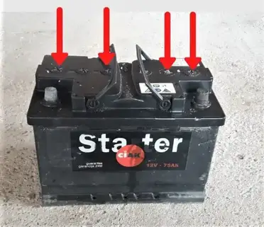 CAUTION Do not charge this battery and get it out of the car soon. One of the first symptoms of a problem with the battery is a rotten egg smell. Conventional acid lead automotive batteries are filled with a mixture of water and sulfuric acid.